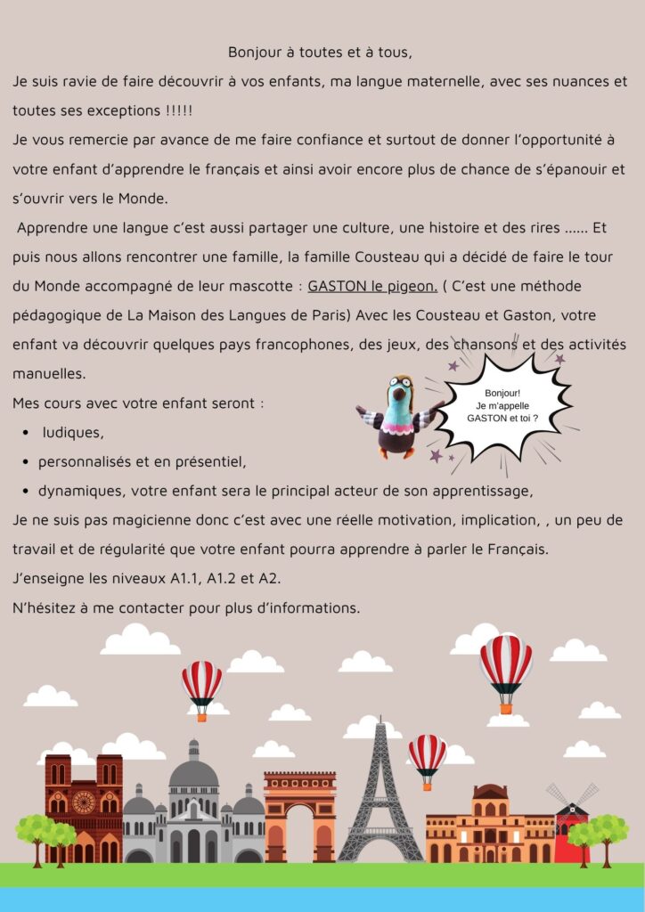 Je suis enseignante de FLE, Français Langue étrangère spécialisée pour les enfants de 5 à 11 ans.